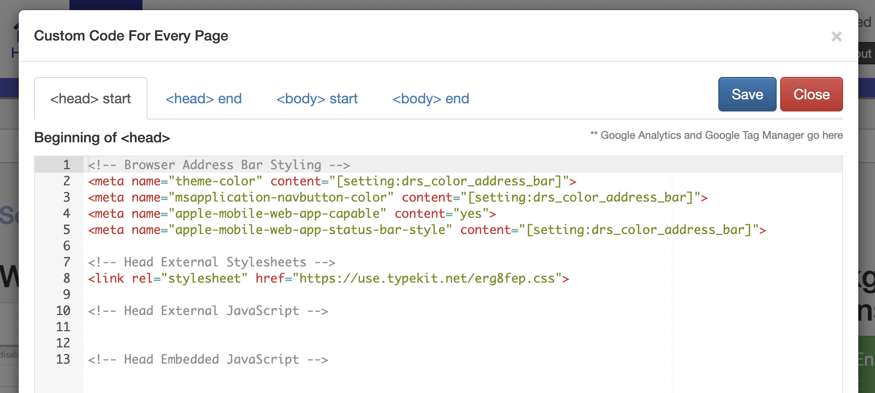 1. "Custom Code for Every Page" - Any code in this section will apply overtop of the default code in the respective sections. Most commonly, this is used for adding tracking codes, such as Google Analytics, and applying custom CSS to restyle page elements. A lot of CSS Styling comes from this section, which is why a webpage may look different in the Responsive Editor.