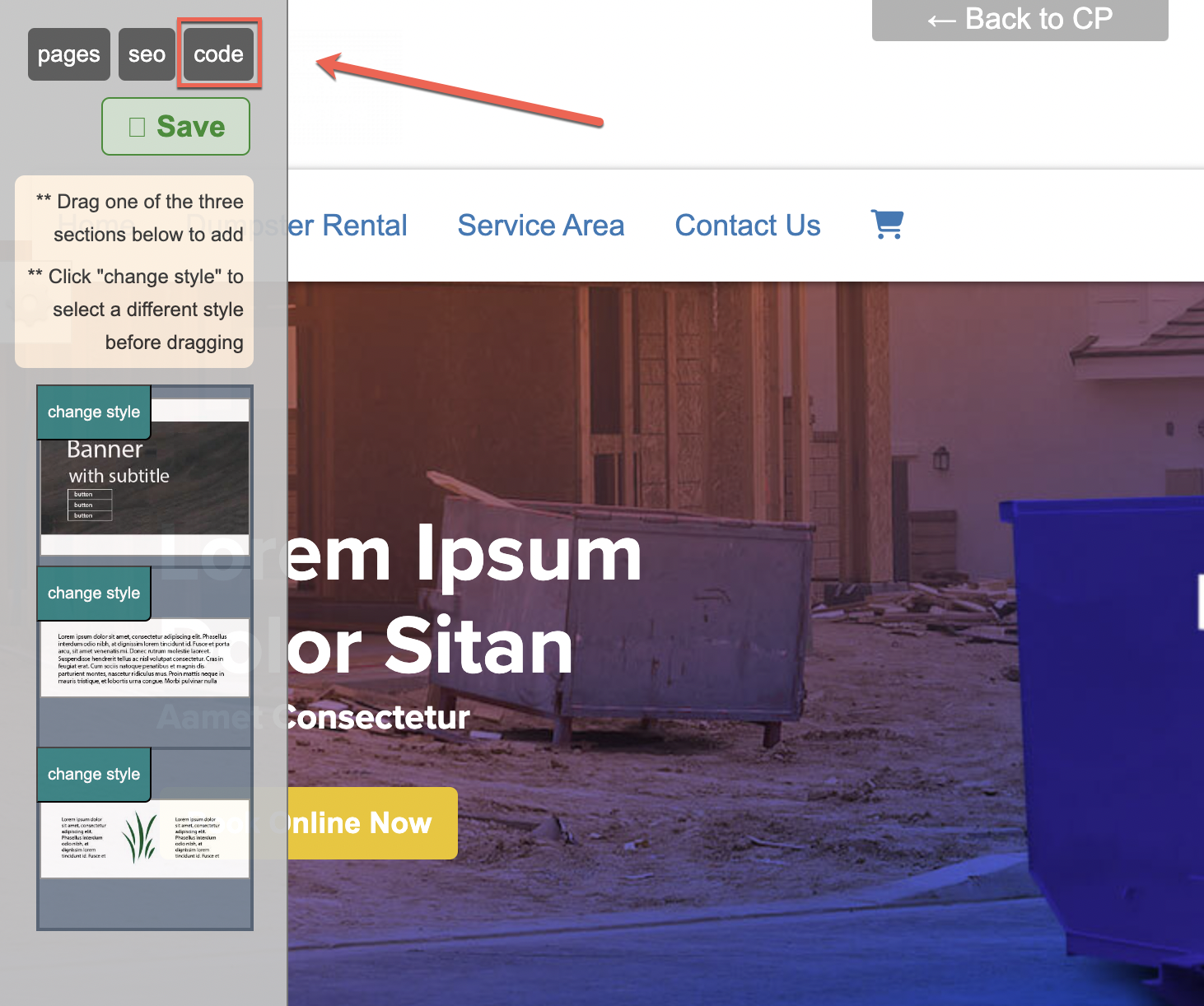4. Custom HTML Section for a Webpage - Our Responsive Editor is comprised of drag-and-drop sections. There is a "<raw HTML>" section available to add custom code within a specific webpage. Click here for an article on adding a custom HTML section to a webpage.