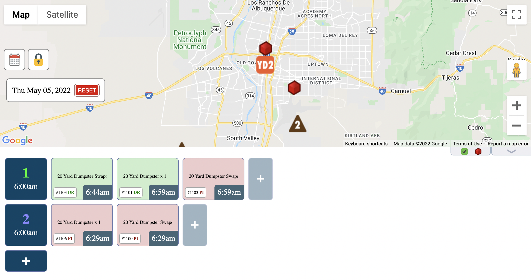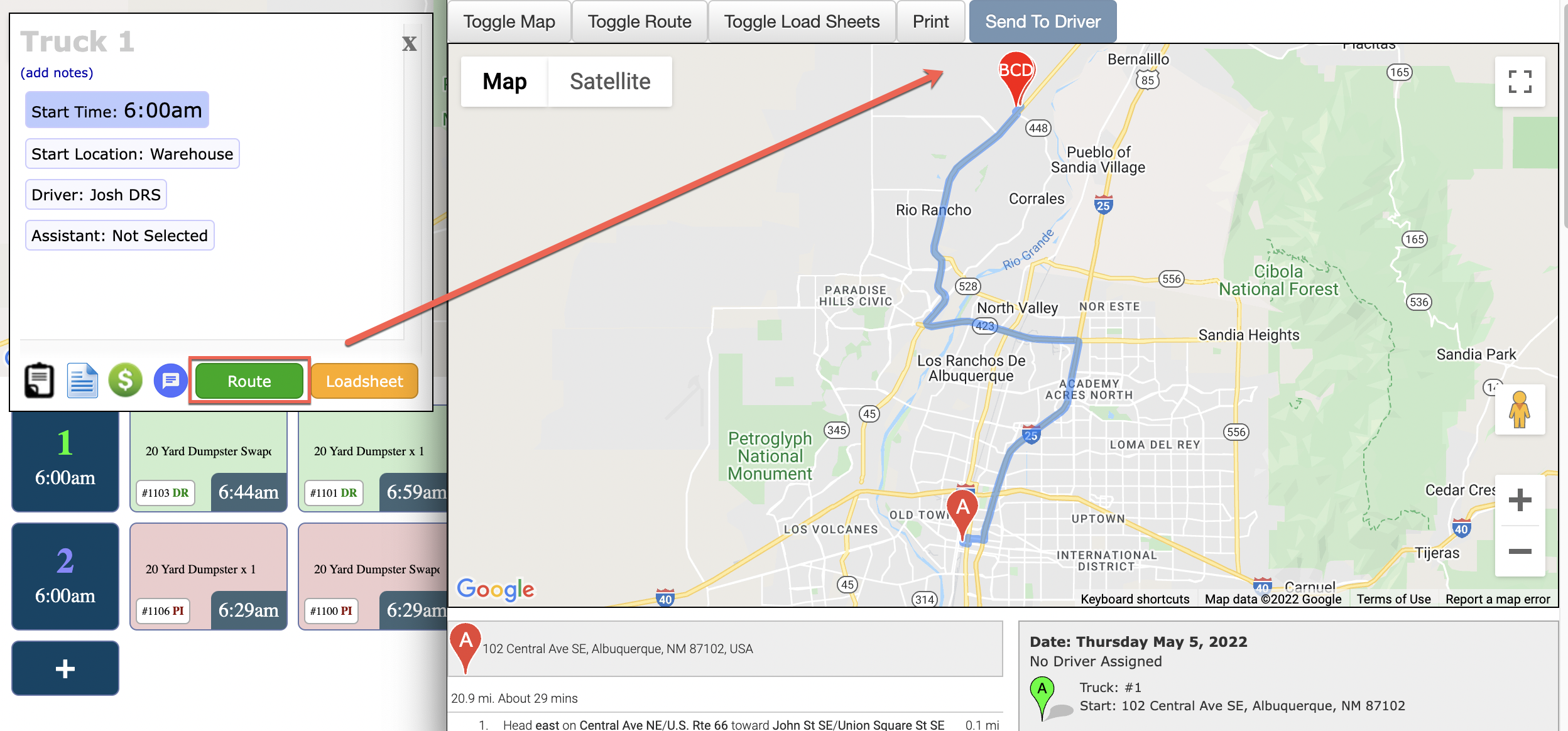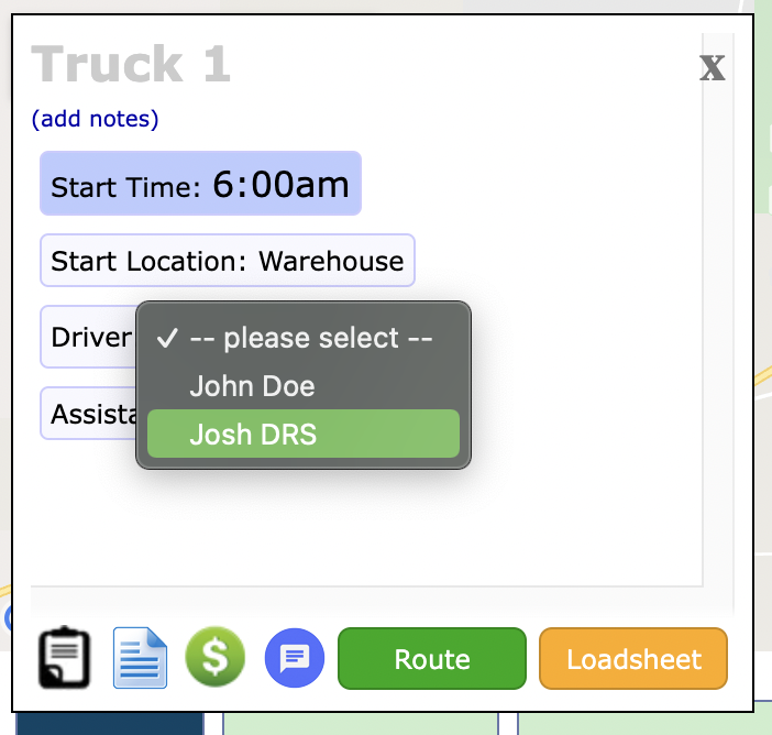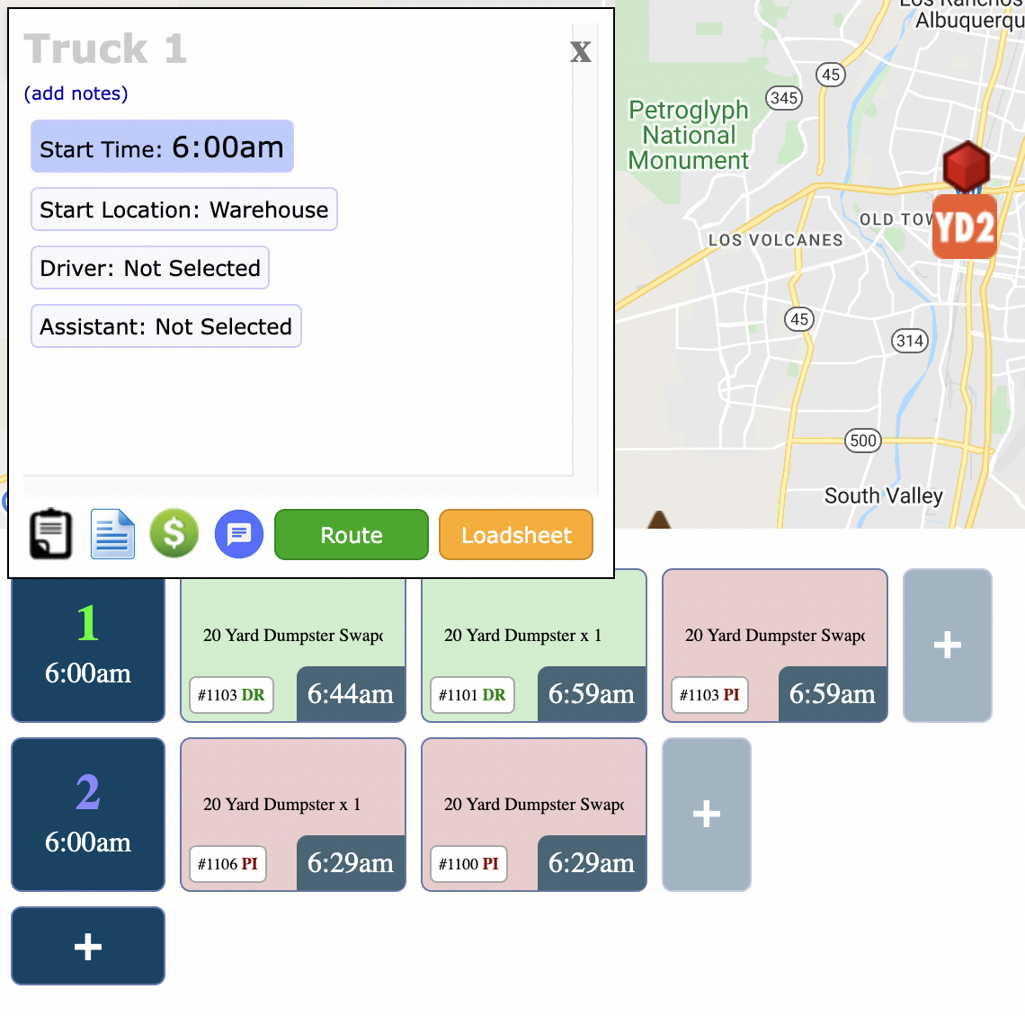 Navigate to the "Delivery" tab (or click the Google Maps icon on "Dispatch" for the current date) and click a day to open up the Routing & Delivery screen. The left-side numbers indicate Truck 1 and Truck 2 in the screenshot below. Click on these numbers to rename the truck, change the start time, change the start location, or assign a driver and/or assistant.