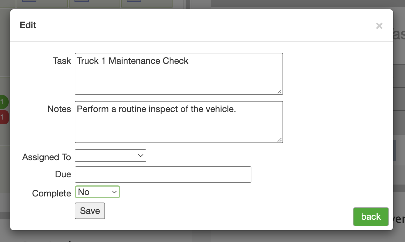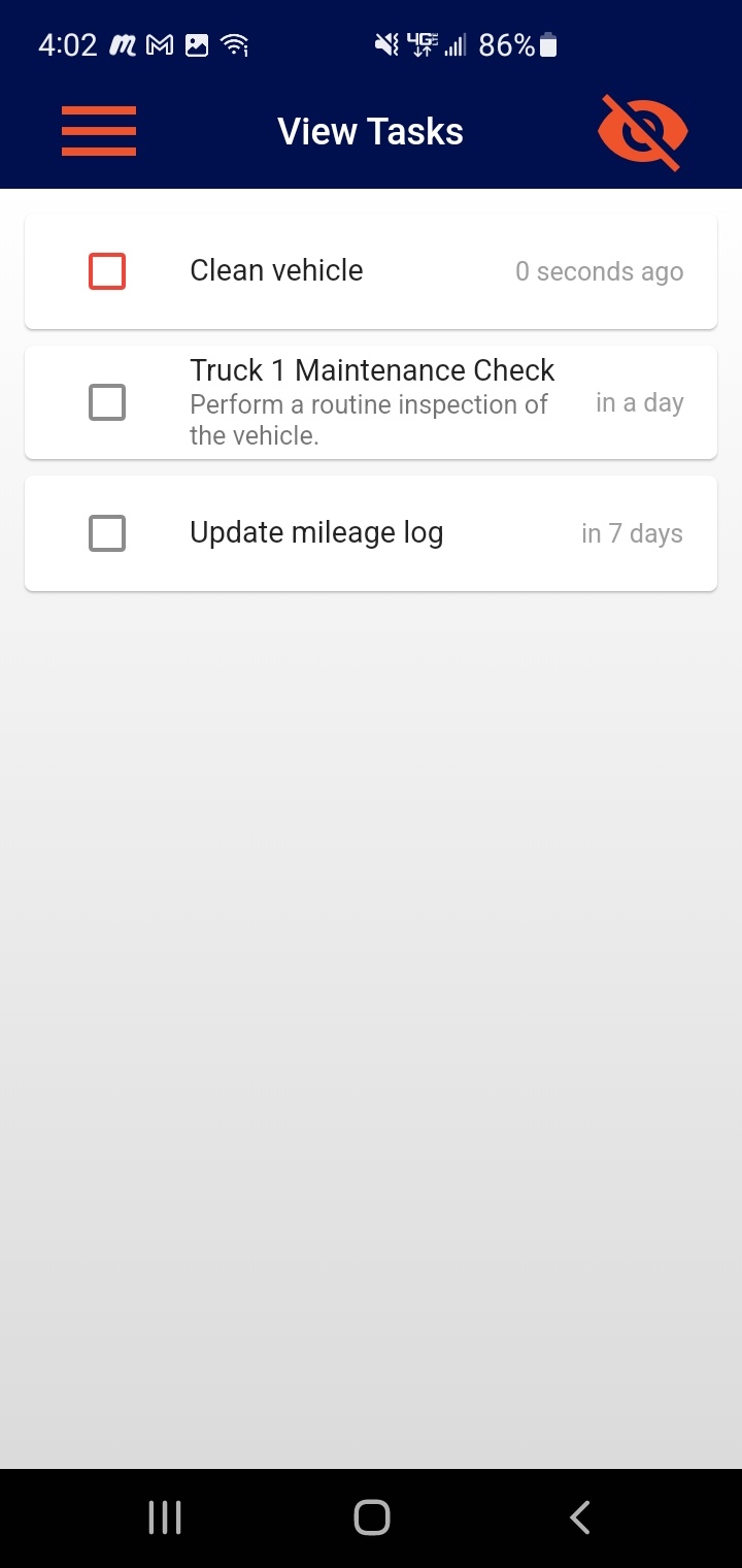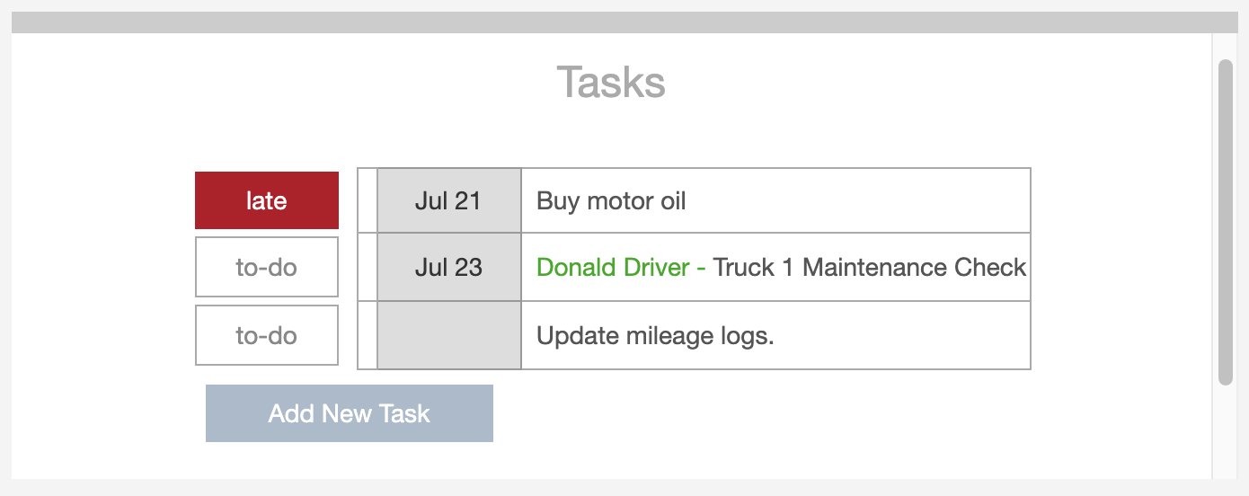 If a task has a due date, it will show a day countdown. "Clean vehicle" below does not have a due date. Drivers can check the box next to the task when one has been completed, which will update the "Home" screen on the Control Panel: