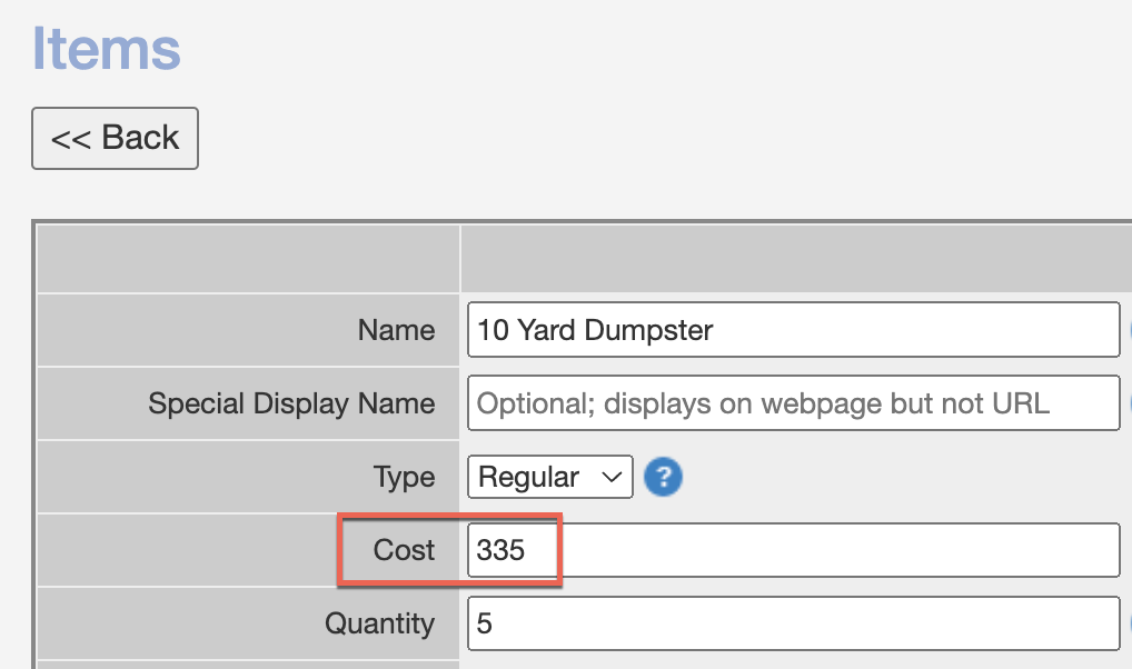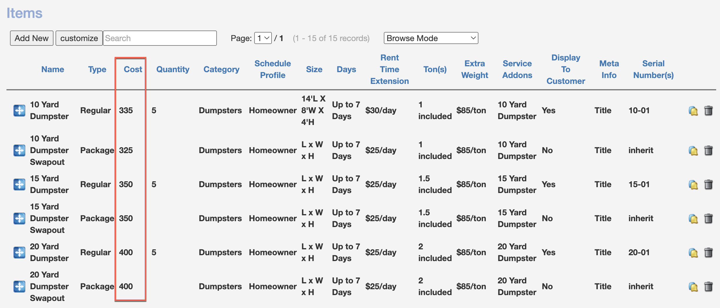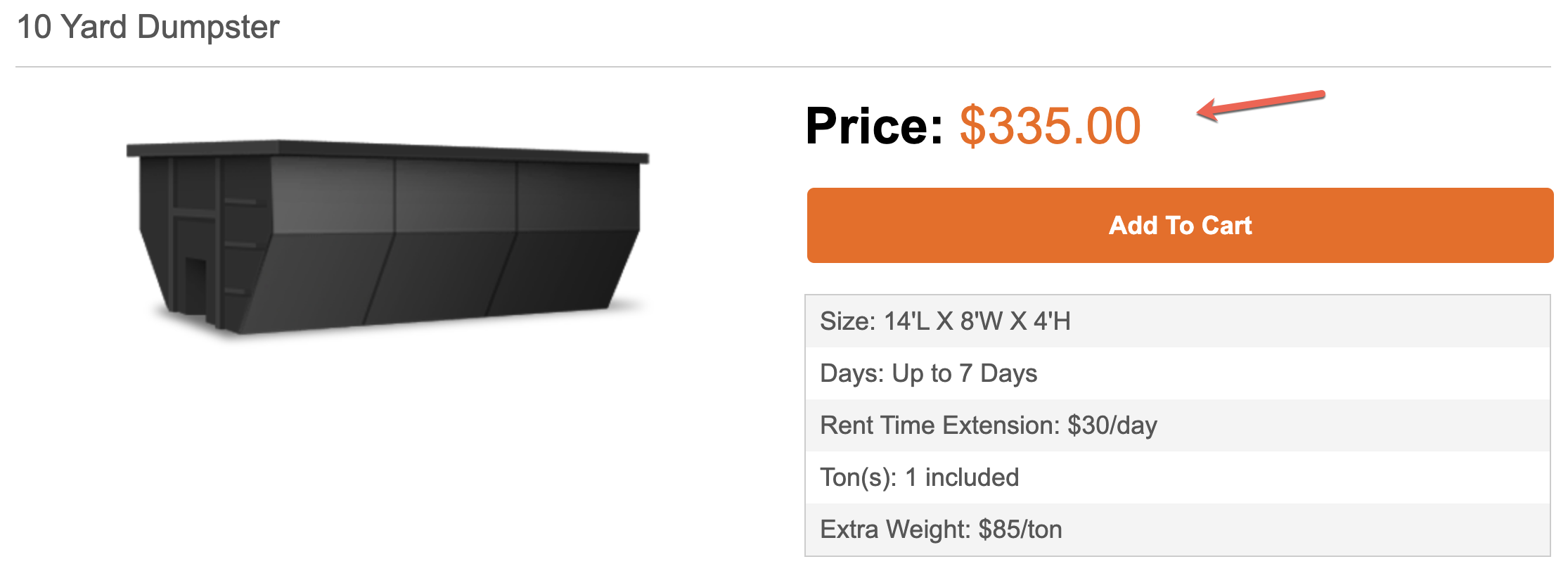 Your dumpster pricing that shows online is editable by navigating to Admin > Products > Items. Click on a specific item to edit the price: