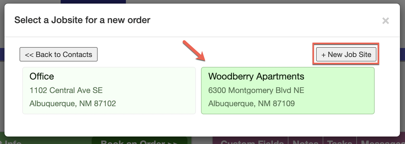 When creating a new order, you will prompted to select the contact followed by the Job Site. Click the appropriate Job Site to automatically use that address on the order. You can also create a new Job Site, if needed: