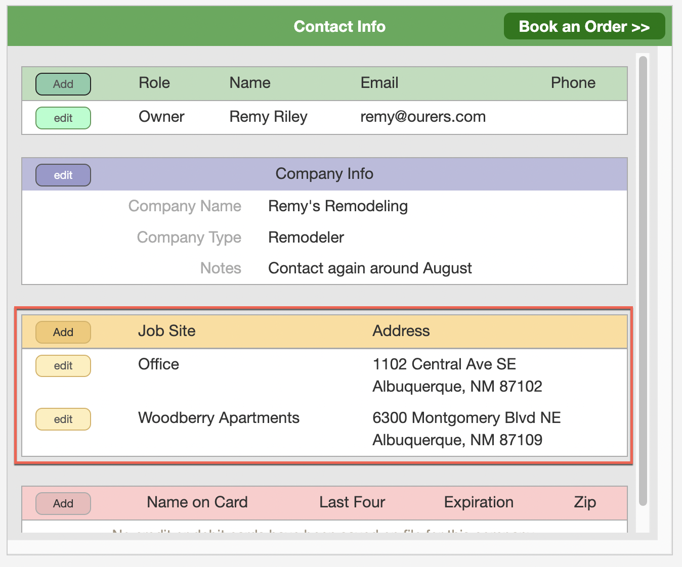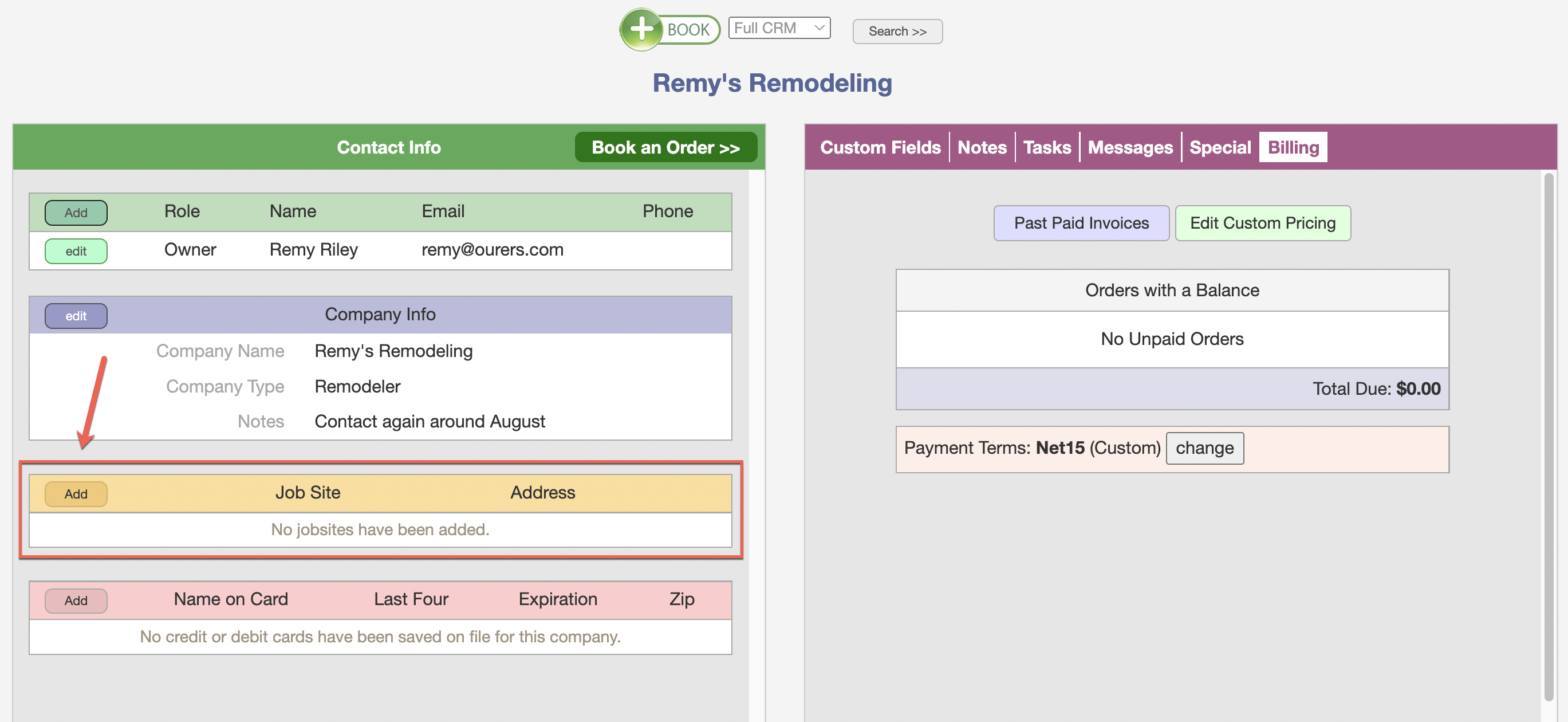 Job Sites are service addresses saved to a Company Profile that can be reused when creating new orders. Once a Company is created, click on the profile to open it. Locate the Job Site area on the left within the customer information box: