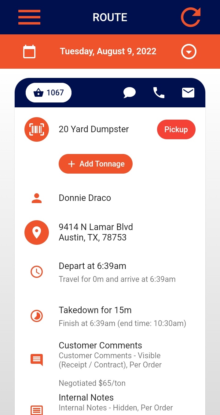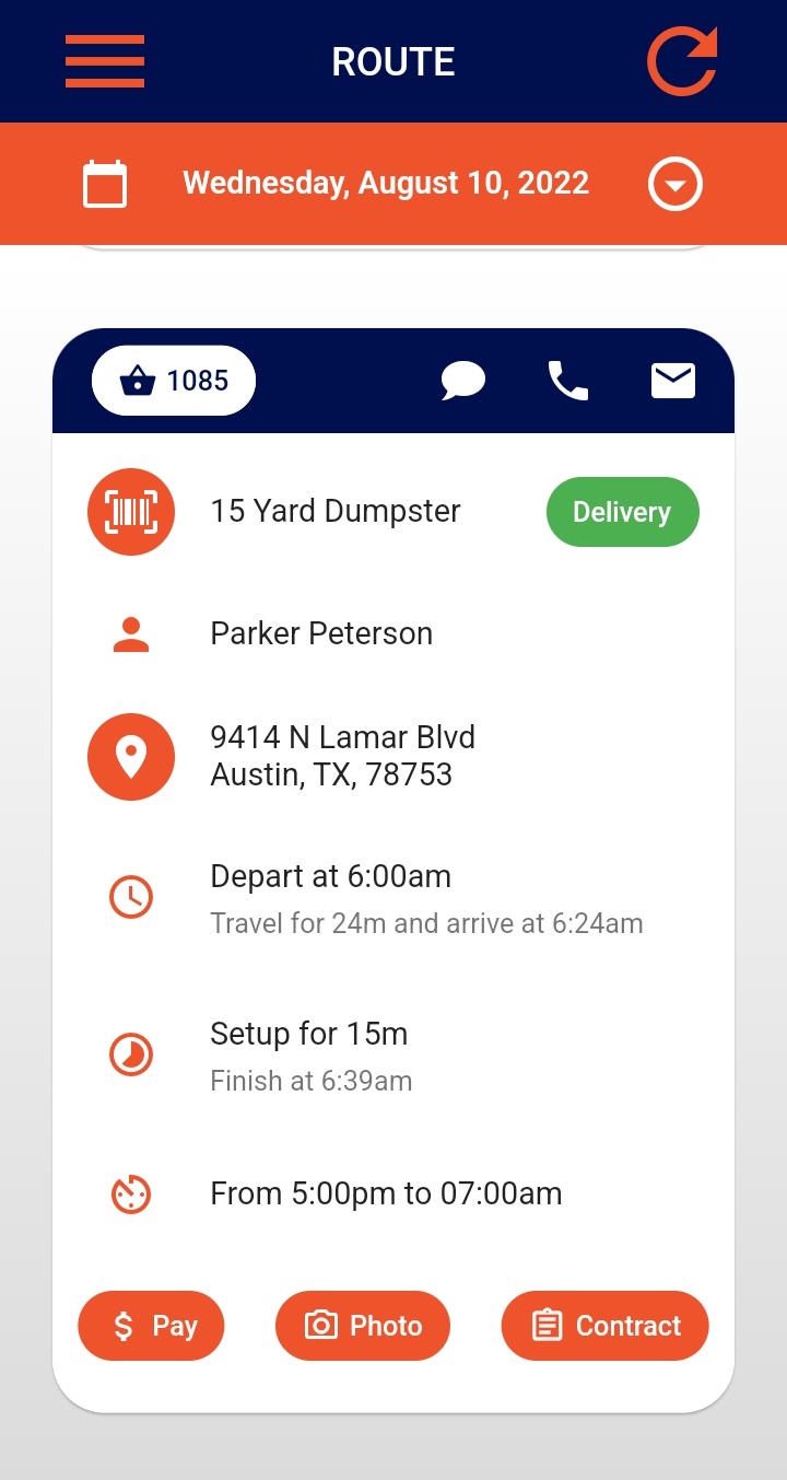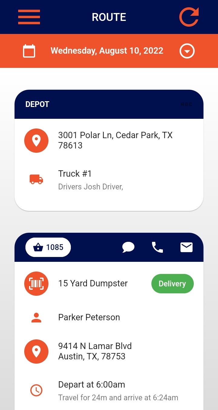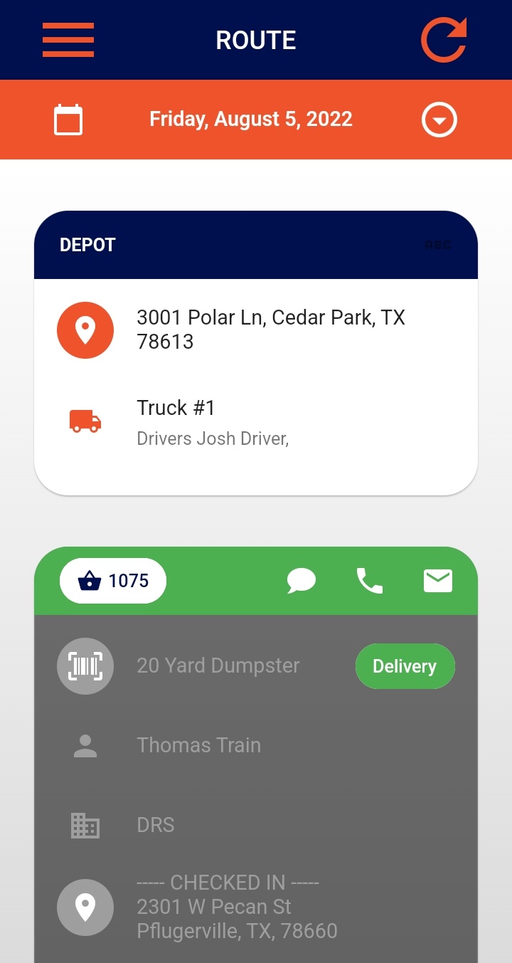• Shows the full route, pickups, notes, dumpster for delivery, etc.