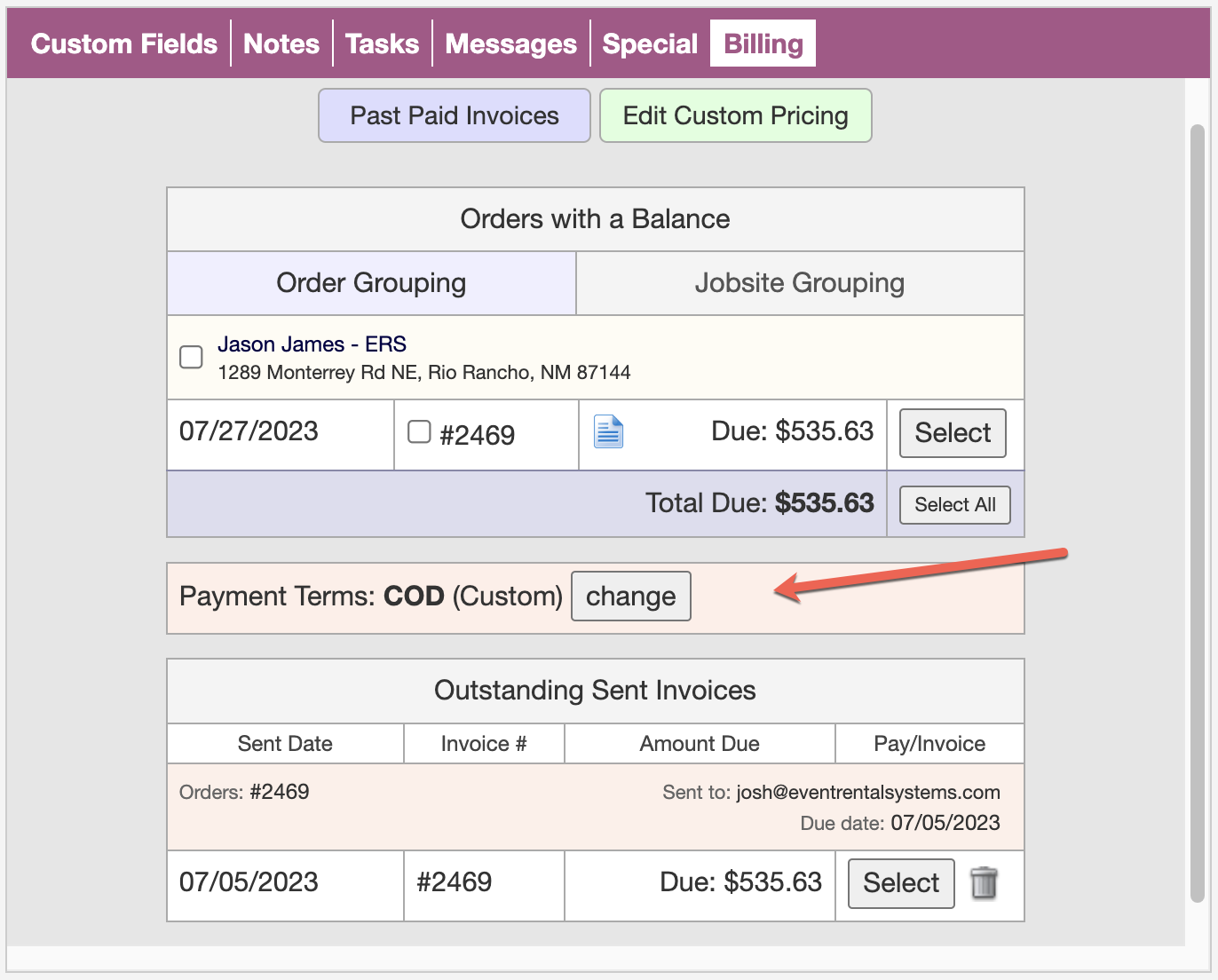 Additionally, you can change the payment terms for individual customers in the Customer Relationship Manager (CRM) from within the "Billing" tab/box. Payment terms for individual clients will always override the account default.