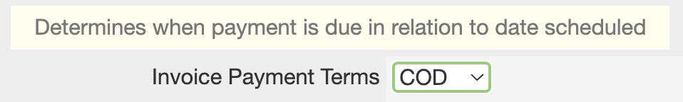 The default Payment Terms on all new accounts is set to "COD" (Cash on Delivery). The Delivery Date is the "Order Start Date", which means that the "Due Date" for any order is the same as the "Order Start Date" by default. These payment terms are editable at the account level or for individual customers. Batch/Combined Invoicing is different and calculates from the "Invoice Sent Date" with more information below.