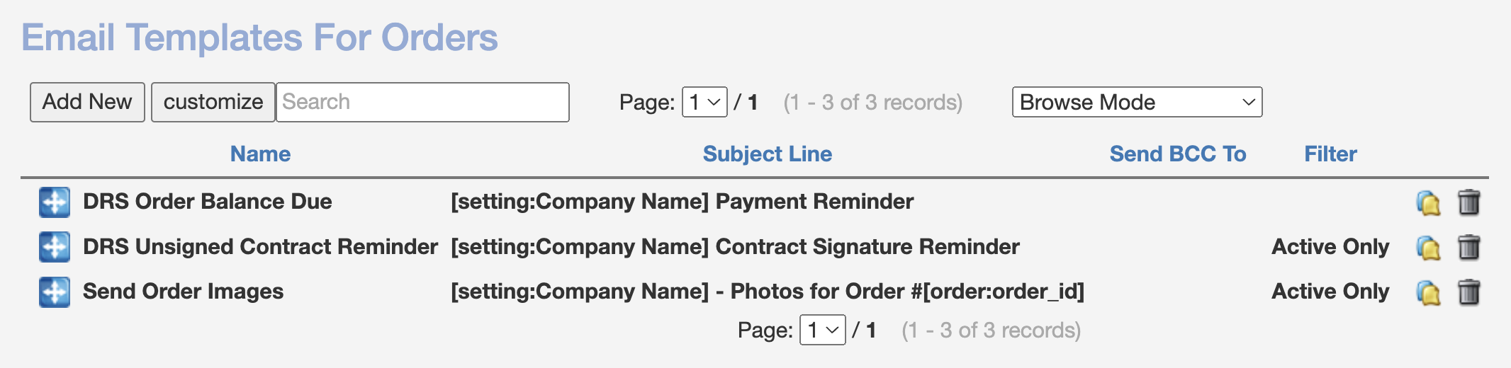 To view and edit available templates, navigate to Admin > Documents > Email Templates For Orders. You can create additional templates as desired by copying existing templates (blue/yellow page icon) or clicking "Add New":
