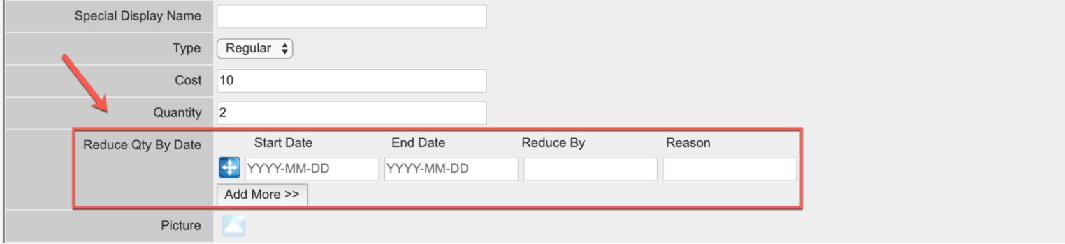 - In the "Reduce Qty By Date" section, use the following date format YYYY-MM-DD (including the hyphens) to indicate the time frame in the "Start Date" and "End Date".
