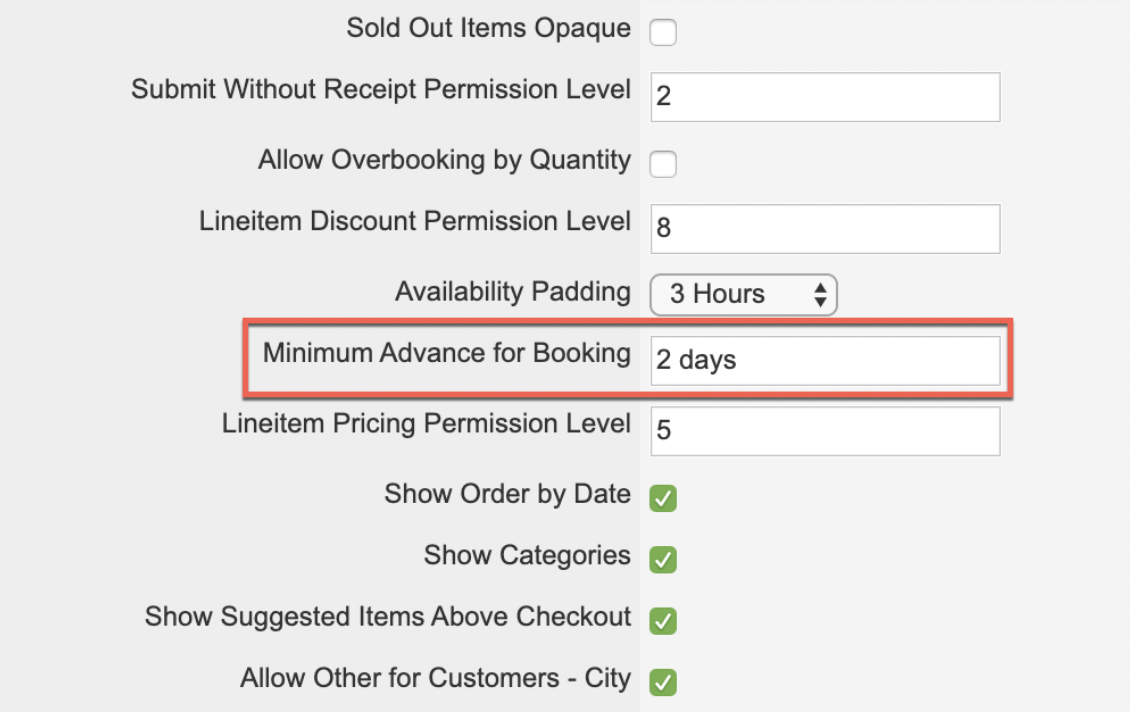 Minimum Advance for Booking determines how far out from today’s date/time that one of your customers can schedule an order. The purpose of this setting is to give you enough time to fulfill an order. Generally, our clients do not want their customers scheduling an order on short notice (such as on the same day or the immediate next day).