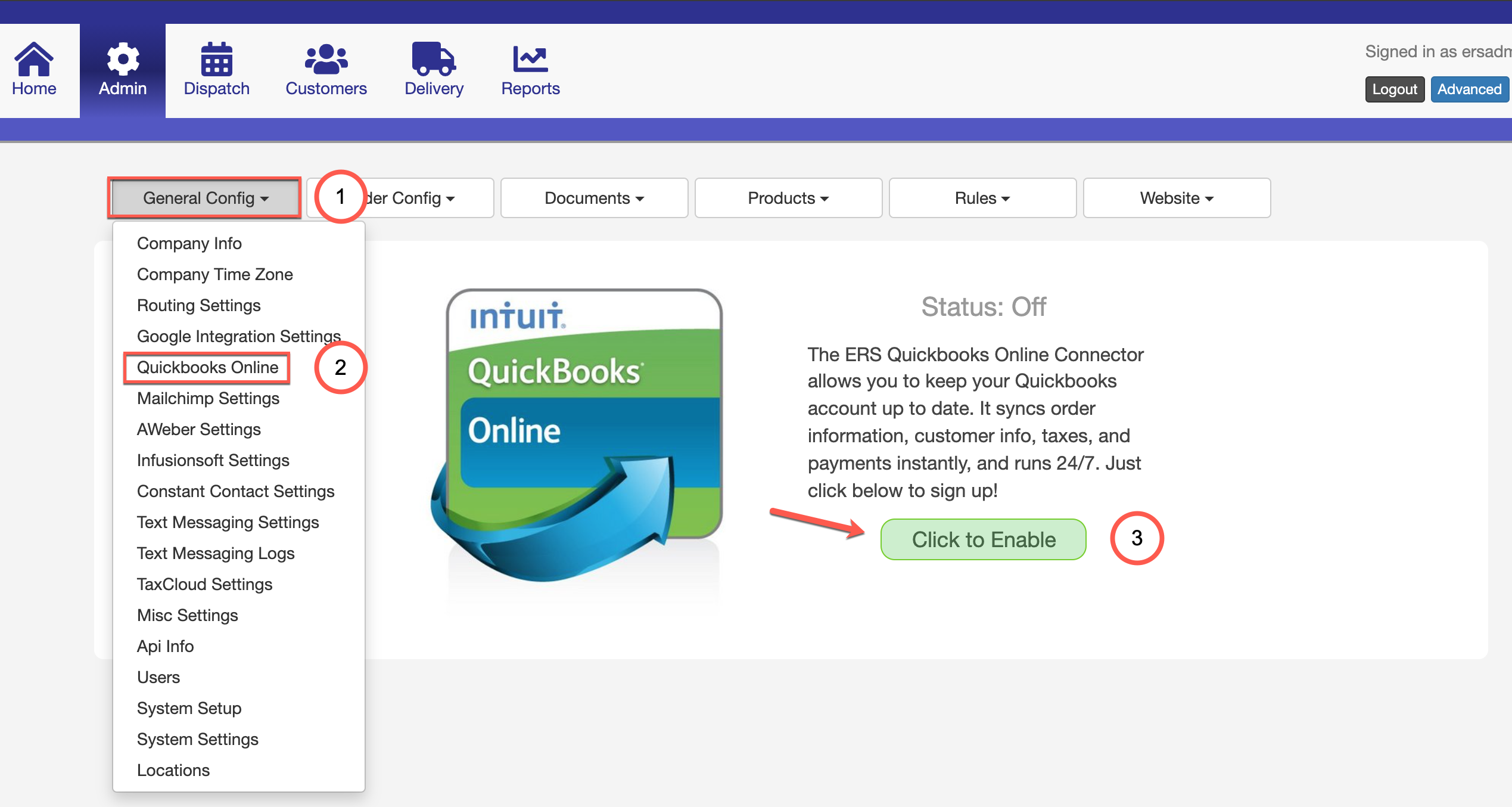 - Link up Intuit Quickbooks Online Account by navigation to Admin > General Config > Quickbooks Online. Press the “Click to Enable” button to sign into your Intuit Quickbooks account.