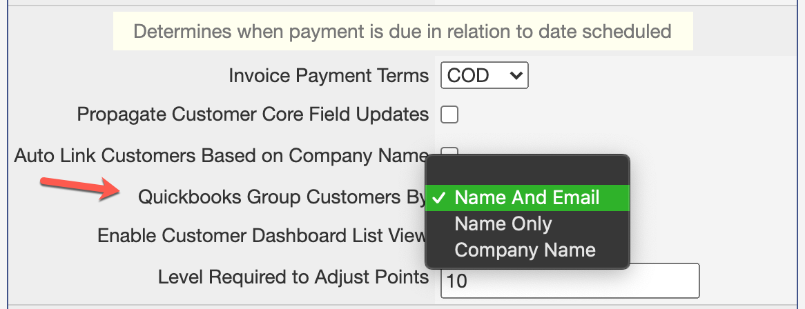 Note: While the system default is name and email, companies that do a large number of business-to-business transactions with the same companies may prefer to sync by Company Name.