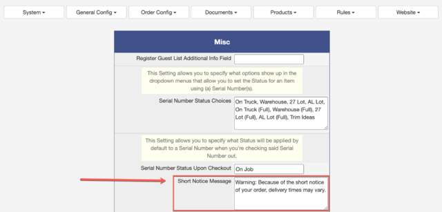 When customers are placing an order online, there is a "Short Notice" message that appears and is customizable. A "Short Notice" order is any order less than 24 hours in advance. To edit the notification for a short notice rental or a next day rental, perform the following: