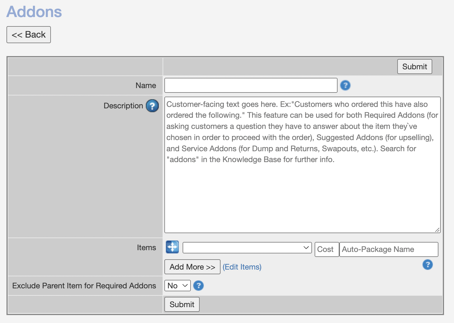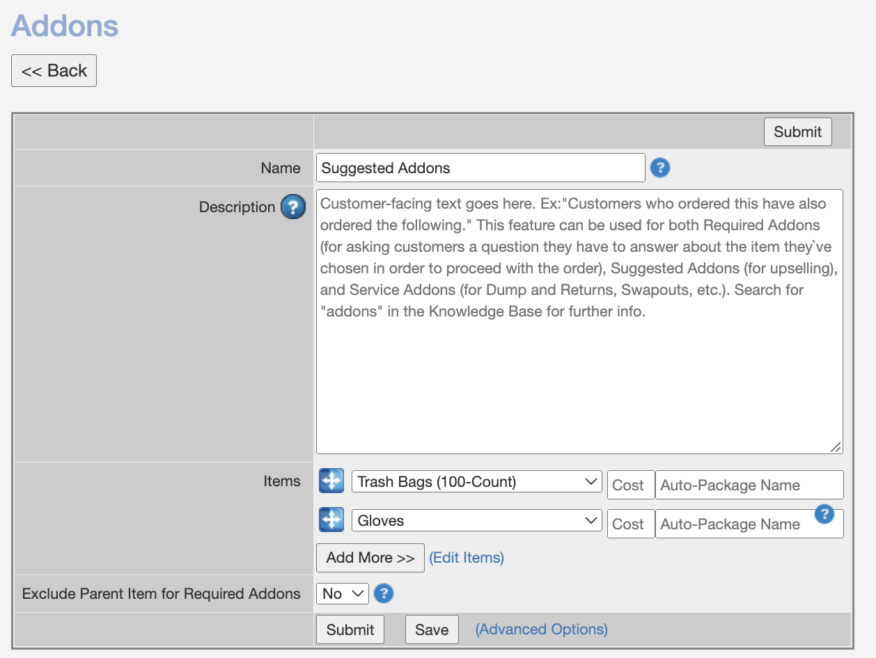 Note: Add-ons pull items from your existing inventory. You may need to add the items or selections to Admin > Products > Items prior to building an Add-on. If you would like to create a list of items to sell with a dumpster, such as a dumpster liner, for example, then it must be added to your inventory first. Generally, these item(s) are hidden from customer view by placing them in the “Hidden Category”. They only appear when attached as part of an Add-on.