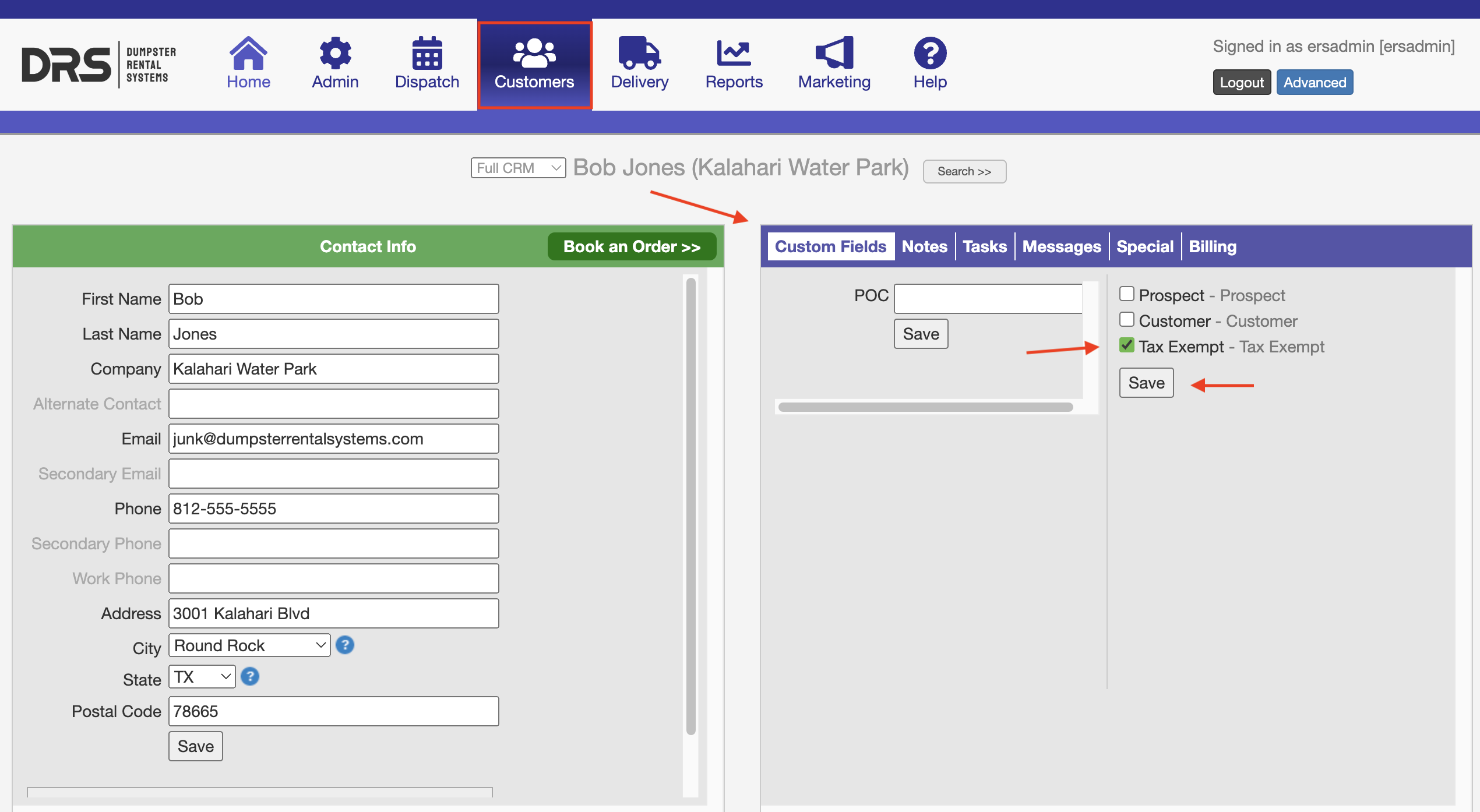 To enable this feature for a specific customer, click the "Customers" tab and open up a customer's profile by clicking the "green people" icon or using the "Search". Within the profile, click the "Custom Fields" tab on the box on the right. Click the "Tax Exempt" checkbox and then "Save":