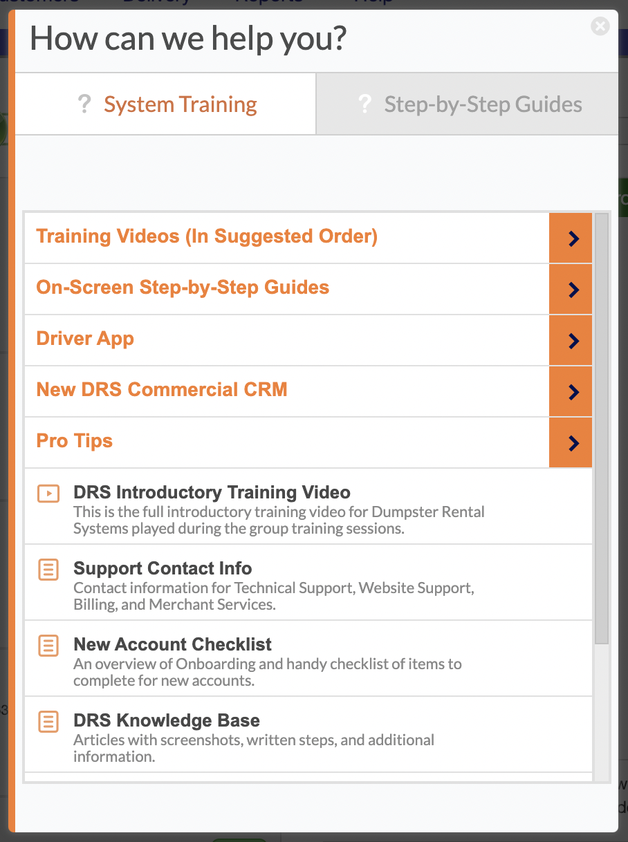 All system training is available through our DRS Academy online courses. You can also access them from the "Help" tab in your Control Panel. See the "System Training" page for course descriptions.