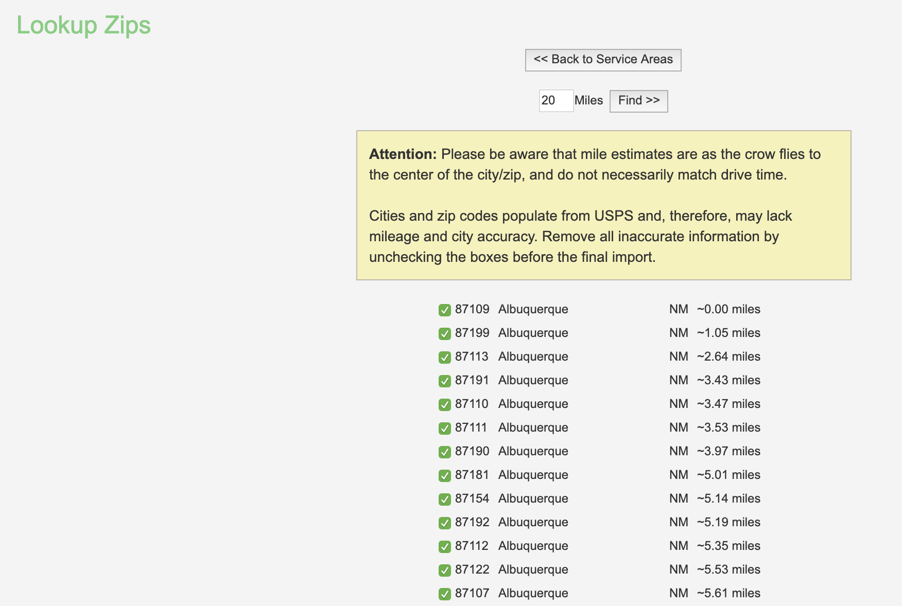 If you do not have any cities or zip codes listed, you can manually add them or use the “Auto-Fill Zip Codes and Cities...” button located at the bottom. Choose your radius and the system will automatically generate cities and zip codes in your area from your Warehouse zip code in Admin > General Config > Company Info:
