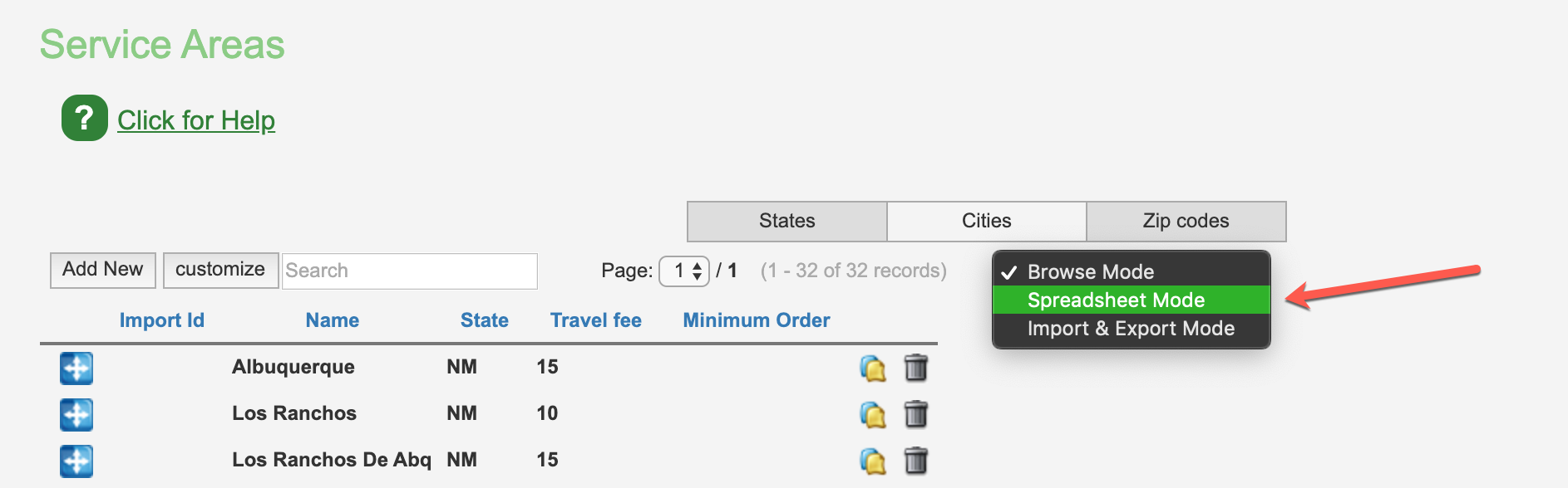 Additionally, you can use “Spreadsheet Mode” from the dropdown box to quickly and easily edit travel fees.